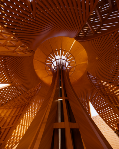 James and his team designed the Temple using a parametric approach, shifting the creative process from manual drafting to algorithmic generation. This allowed the team to generate complex, organic curves using straight pieces of timber, something that would be nearly impossible to design by hand, and to realize a highly expressive form through careful, intentional construction.