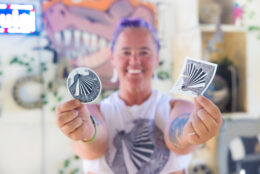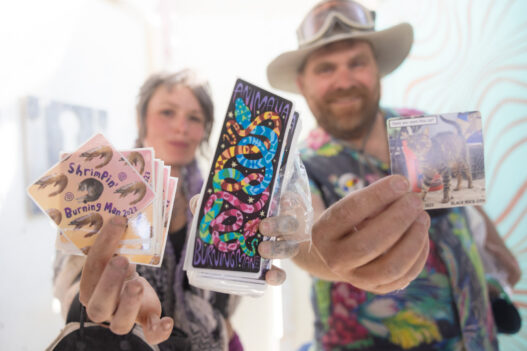 Cover photo: Black Rock City 2023 sticker designers hold their designs up in front of Media Mecca (Photo by Jamen Percy)